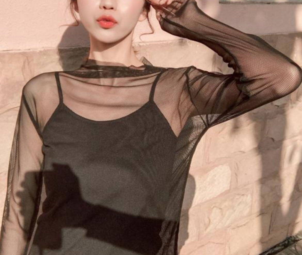 Free Shipping-BLACK MESH LONG SLEEVE TOP
