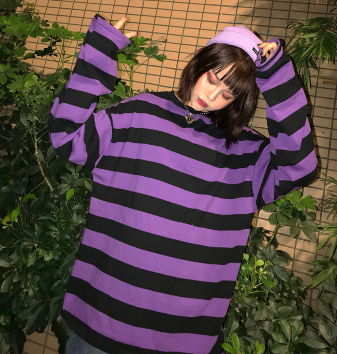 Free Shipping-VINTAGE PURPLE AND BLACK LONG SLEEVE TEE