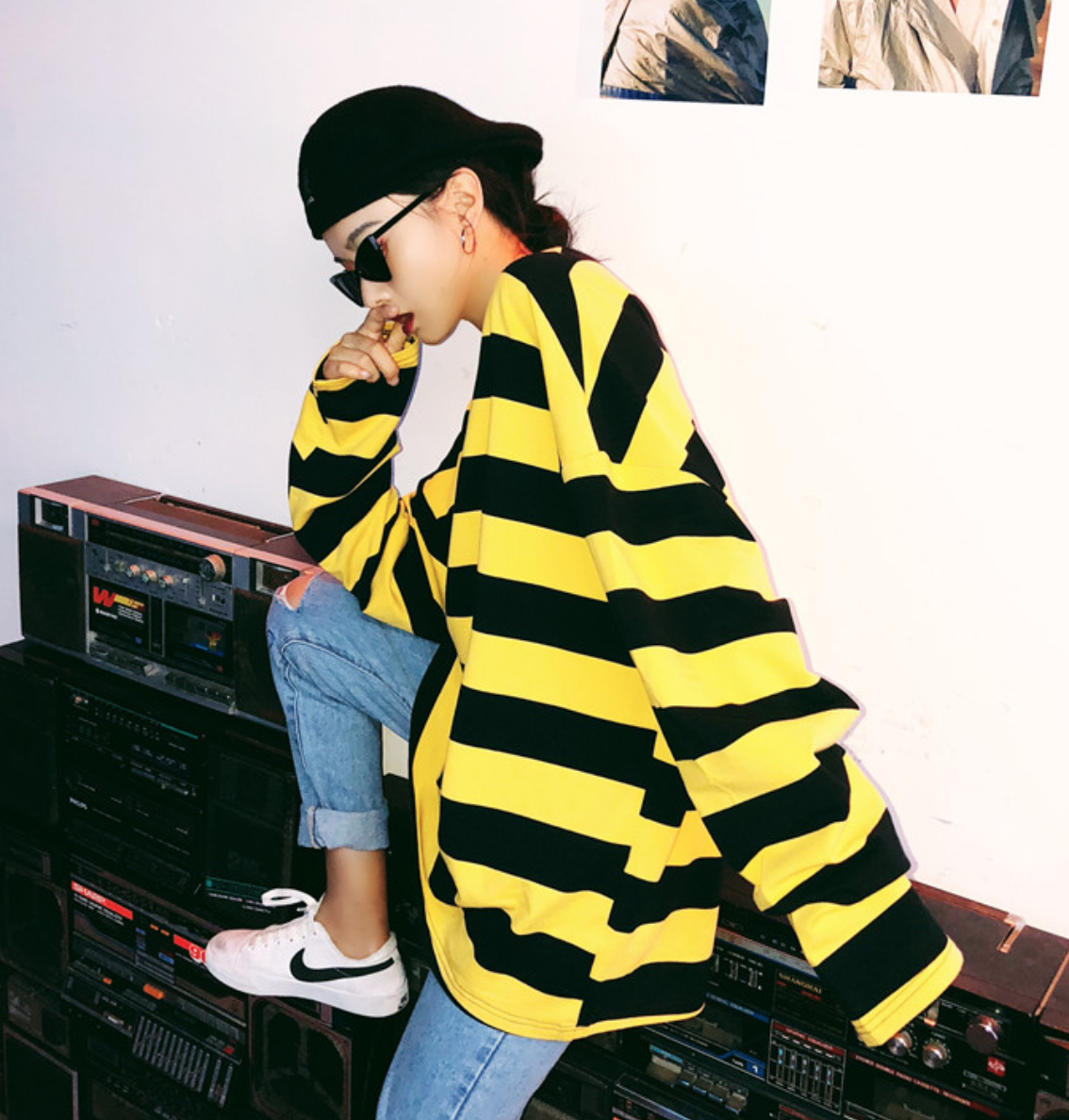 Free Shipping-YELLOW AND BLACK OVERSIZED STRIPE SWEATER