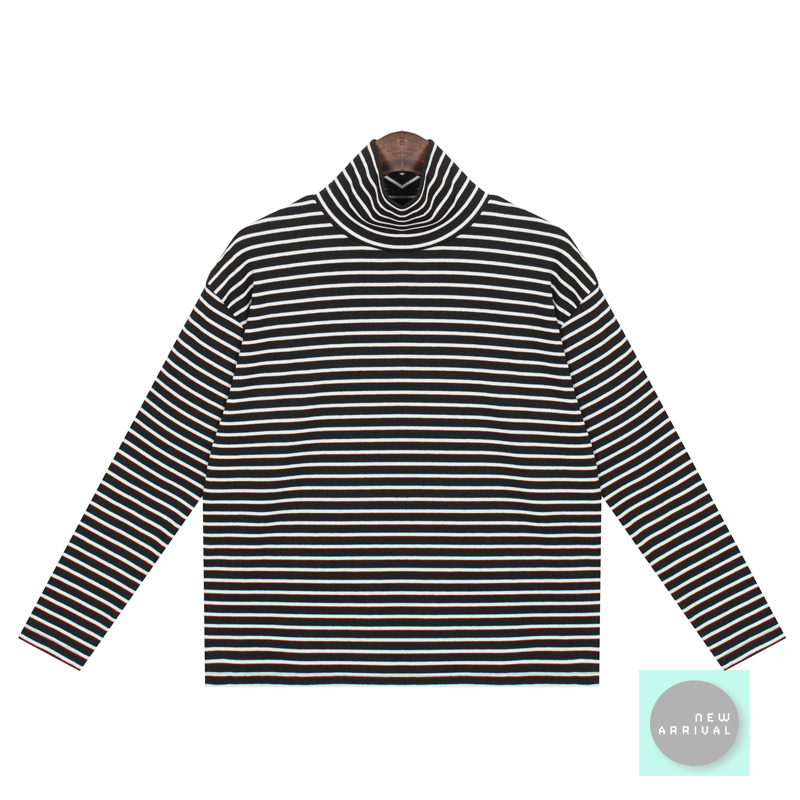Free Shipping-BLACK / WHITE HIGH NECK STRIPE LONG SLEEVE TEE