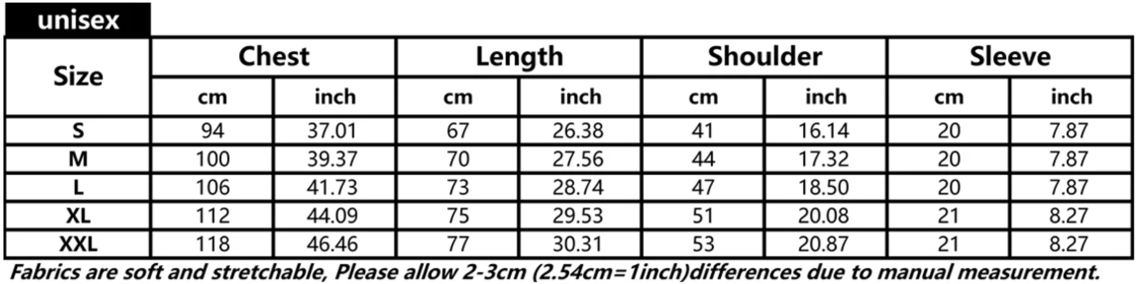 2XL: Chest 118 cm, Length 75 cm, Shoulder 58 cm, Sleeve 23 cm
