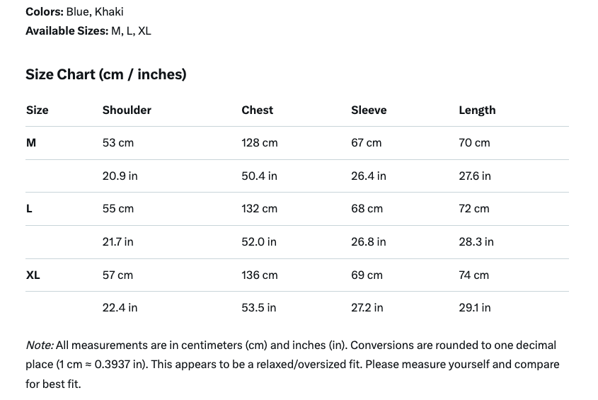 *Note: All measurements are in centimeters. This appears to be a relaxed/oversized fit (e.g., chest 128–136 cm). Please measure yourself and compare for best fit.